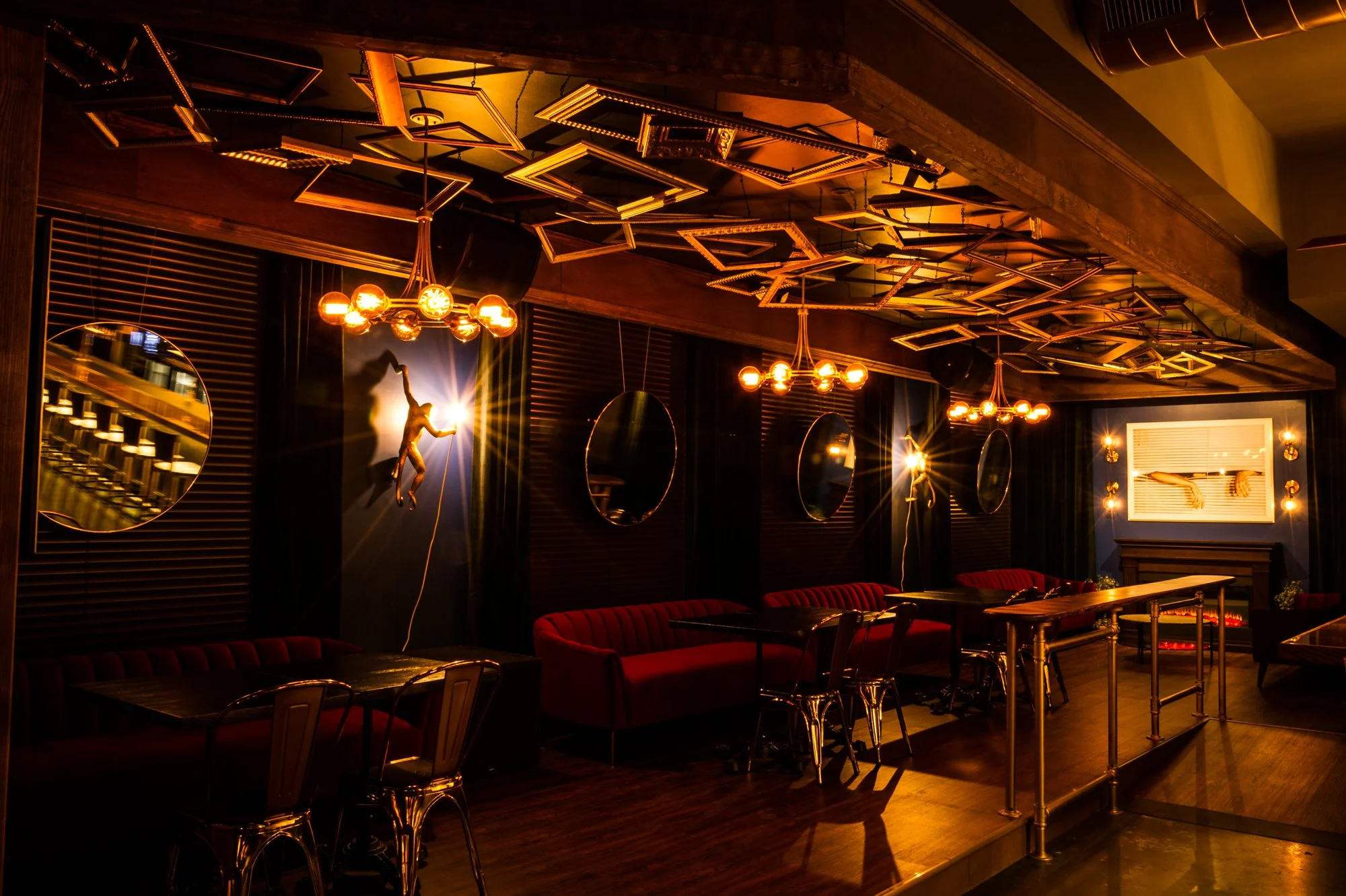 In the dining areas, long channel-back banquettes in striped, earth-tone upholstery run along the walls, paired with simple square wood tables and slender black metal chairs. One feature wall layers a graphic backdrop, a rhythm of tall arched mirrors, and a row of globe pendants to create depth and sparkle; another vignette centers on a masonry fireplace framed by horizontal reclaimed-style wood planks and dark steel bands, overhead a ceiling installation of large metal cylinders that glow softly inside and give a sense of theatrical enclosure. Split firewood is stacked as both functional storage and a sculptural element, reinforcing the “feast, fire, and marrow” story. Black metal screens and latticework subtly divide zones without closing them off, while the overall lighting strategy—lots of warm, low-level points—keeps the room moody and flattering, inviting guests to “come early and stay late.”